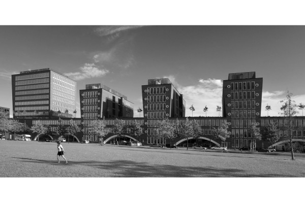 Dadurch bekommt die gemeinsame öffentliche Grünfläche eine klare Raumkante, es entstehen halböffentliche Innenhöfe, in denen die Eingänge zu den einzelnen Bürobauten leicht auffindbar sind (Adressbildung).